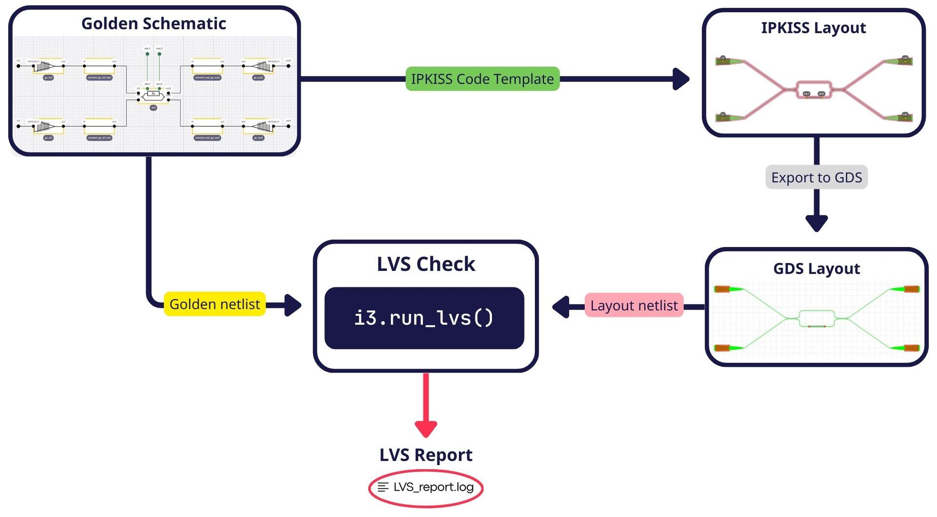 Luceda IPKISS combines the strengths of schematic-driven and code-driven design flows. Designers can start from a golden schematic, simulate the circuit, and automatically generate and refine code to produce a GDS layout. From any finalized GDS layout, a schematic can be extracted, simulated, and verified against the original golden schematic to ensure full design consistency.