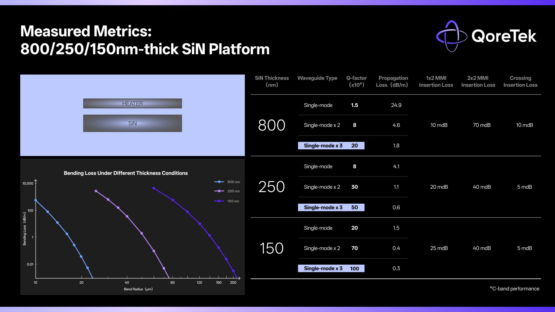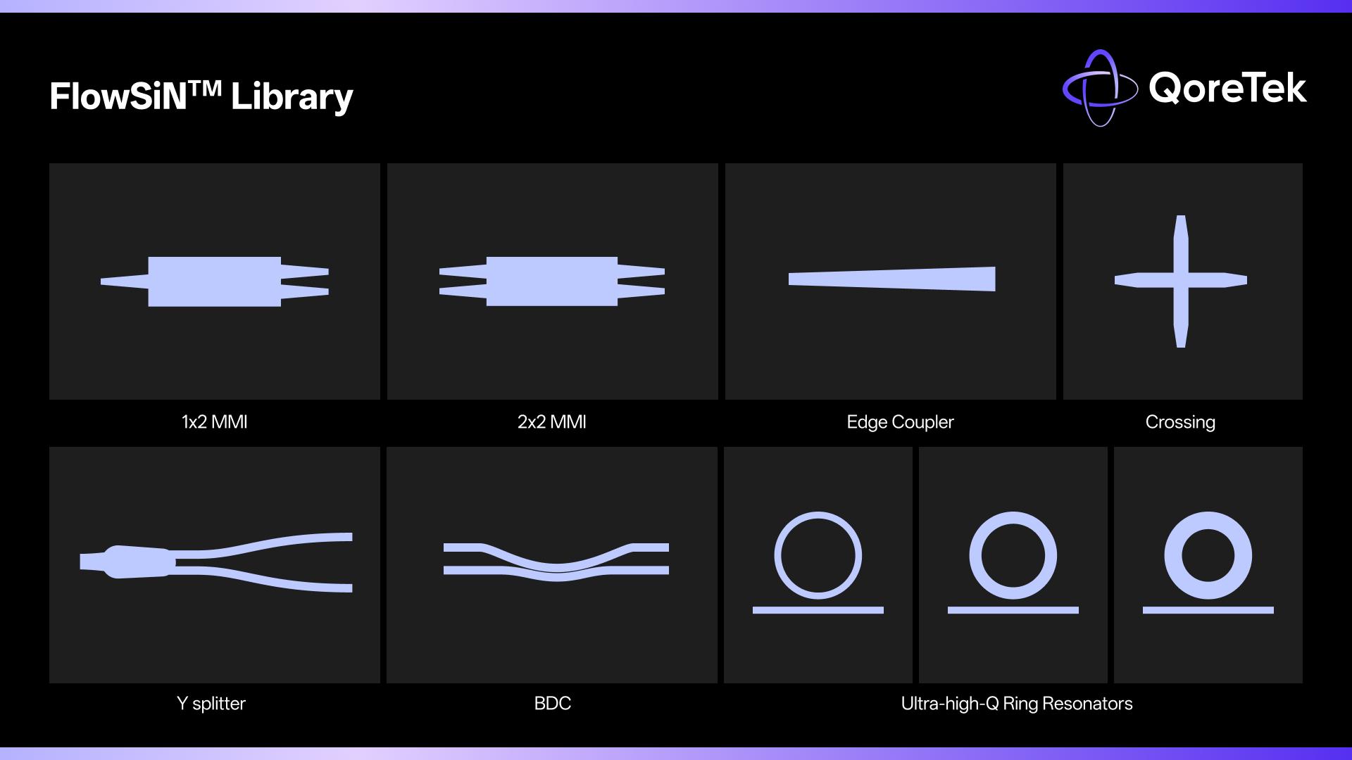 QoreTek’s FlowSiN™ platform is a validated ultra-low-loss Si₃N₄ process, developed to provide a mature and industrial-scale foundation for photonic integration. Supporting multi-thickness and multi-structure design solutions, FlowSiN™ has undergone extensive testing for process maturity, device performance, and data verification, providing Luceda’s customers with a stable and scalable path for both research and industrial applications.